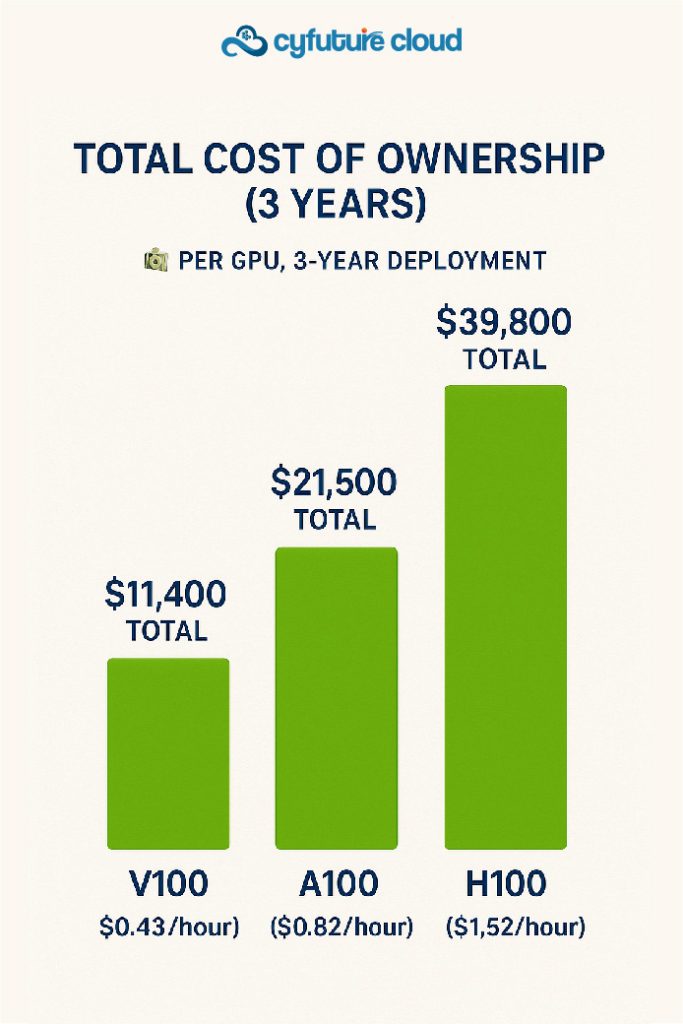 Newer architectures maintain value better initially but face steeper depreciation as next-generation GPUs launch. V100’s depreciation has flattened, making used V100s attractive for budget-conscious buyers.
