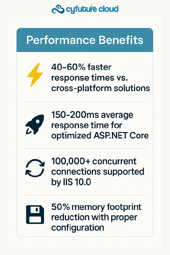 Response Time Optimization: Windows Cloud Hosting with IIS can handle HTTP requests with average response times of 150-200 milliseconds for well-optimized ASP.NET Core applications. Compare this to cross-platform solutions that often exceed 300-400 milliseconds under similar load conditions.